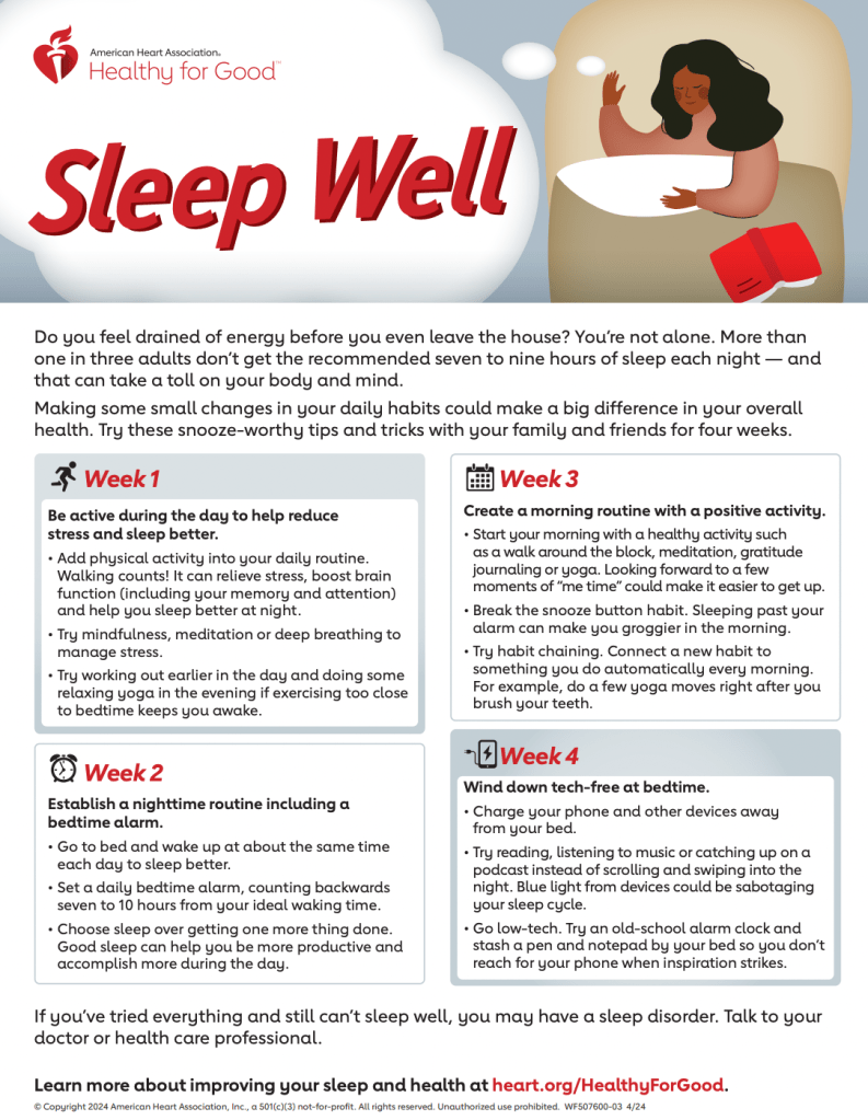 The “Sleep Well” infographic from the American Heart Association effectively communicates how to build better sleep habits over four weeks using thoughtful design and a clear, progressive structure.