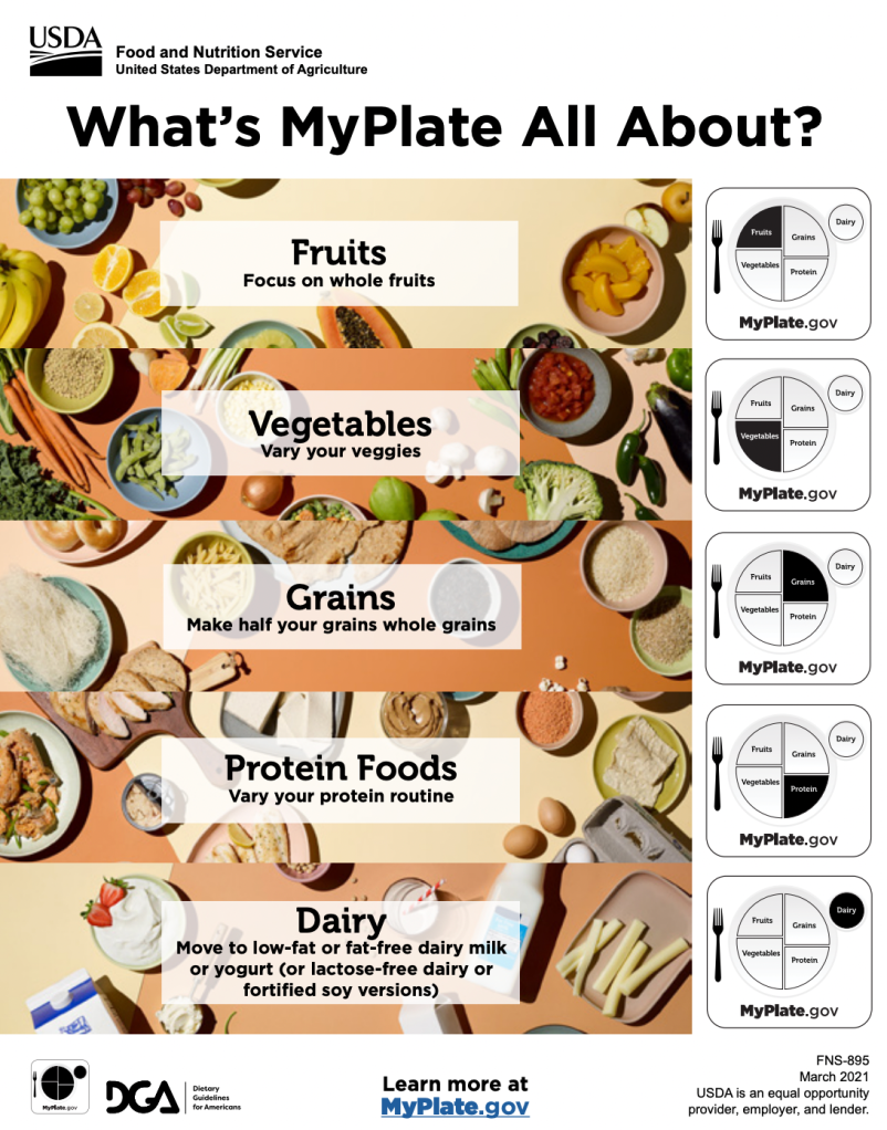 The “What’s MyPlate All About?” infographic from the USDA effectively communicates healthy eating habits through smart design choices.
